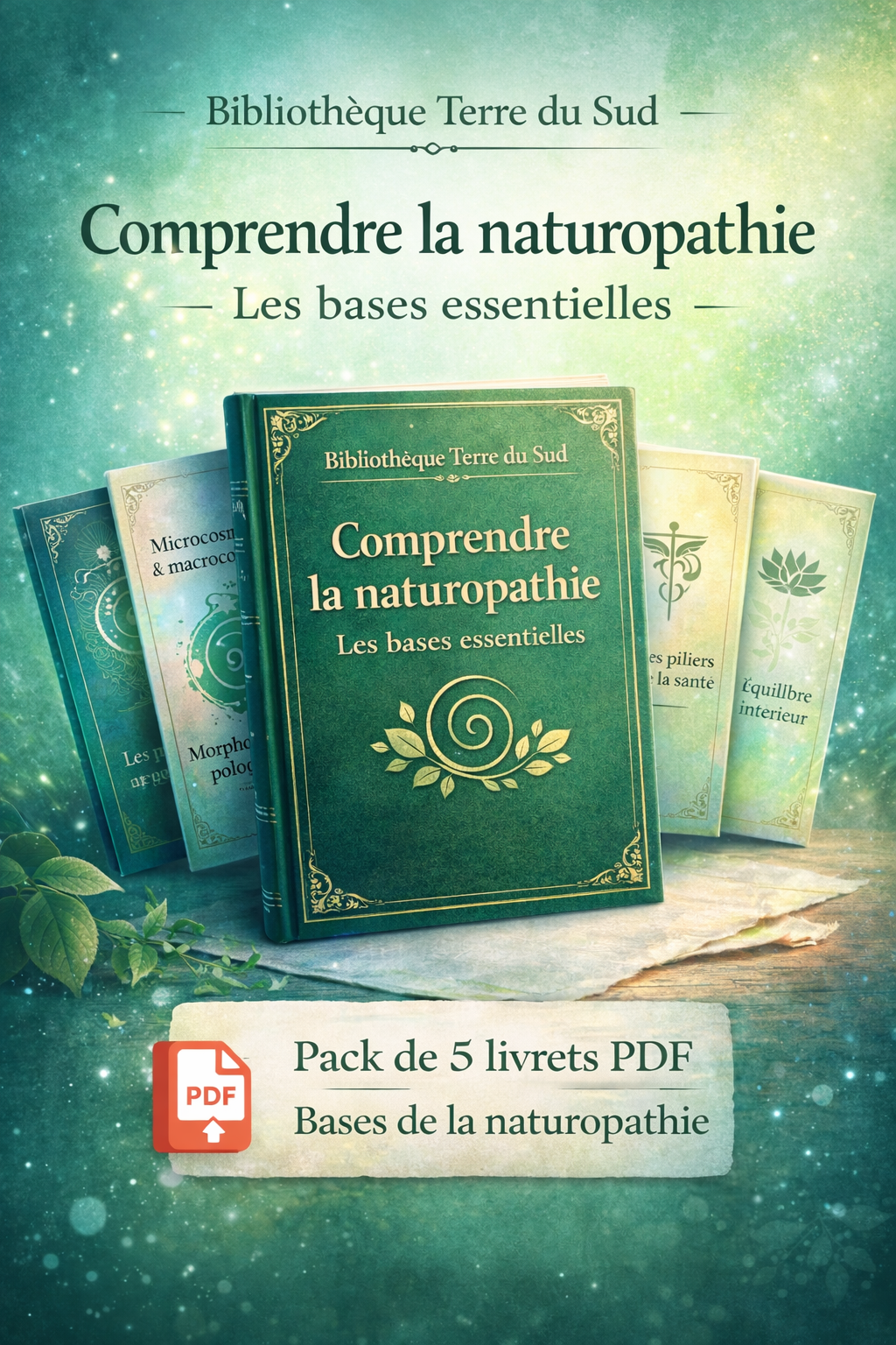 5 livrets pour comprendre les bases de la naturopathie : terrain, morphotypologie, piliers de santé et équilibre intérieur.
